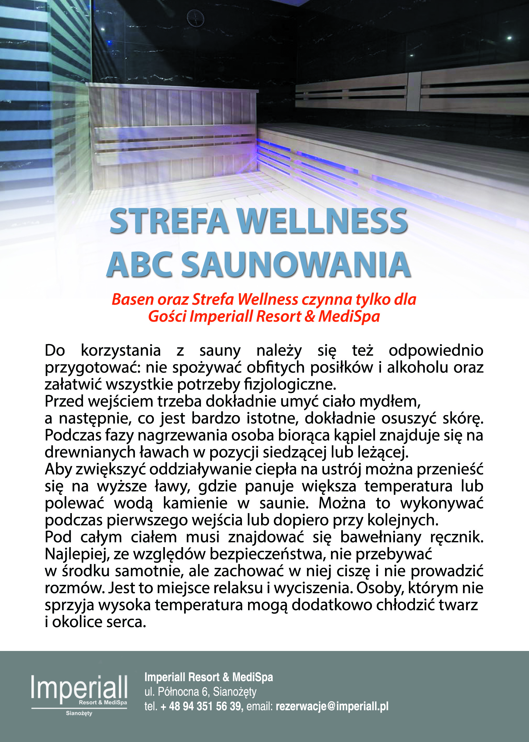 Innowacyjny basen wyposażony w nowoczesny system uzdatniania wody o znikomej zawartości chloru, w którego skład wchodzi: wydzielony tor do pływania o długości 12,5m, strefa rekreacyjna, brodzik dla dzieci, zjeżdżalnia, jacuzzi dla 6 osób, bezpośrednie wejście do Strefy Wellness – z kolejnym jacuzzi, łaźnią parową, sauną fińską i tężnia solankową.