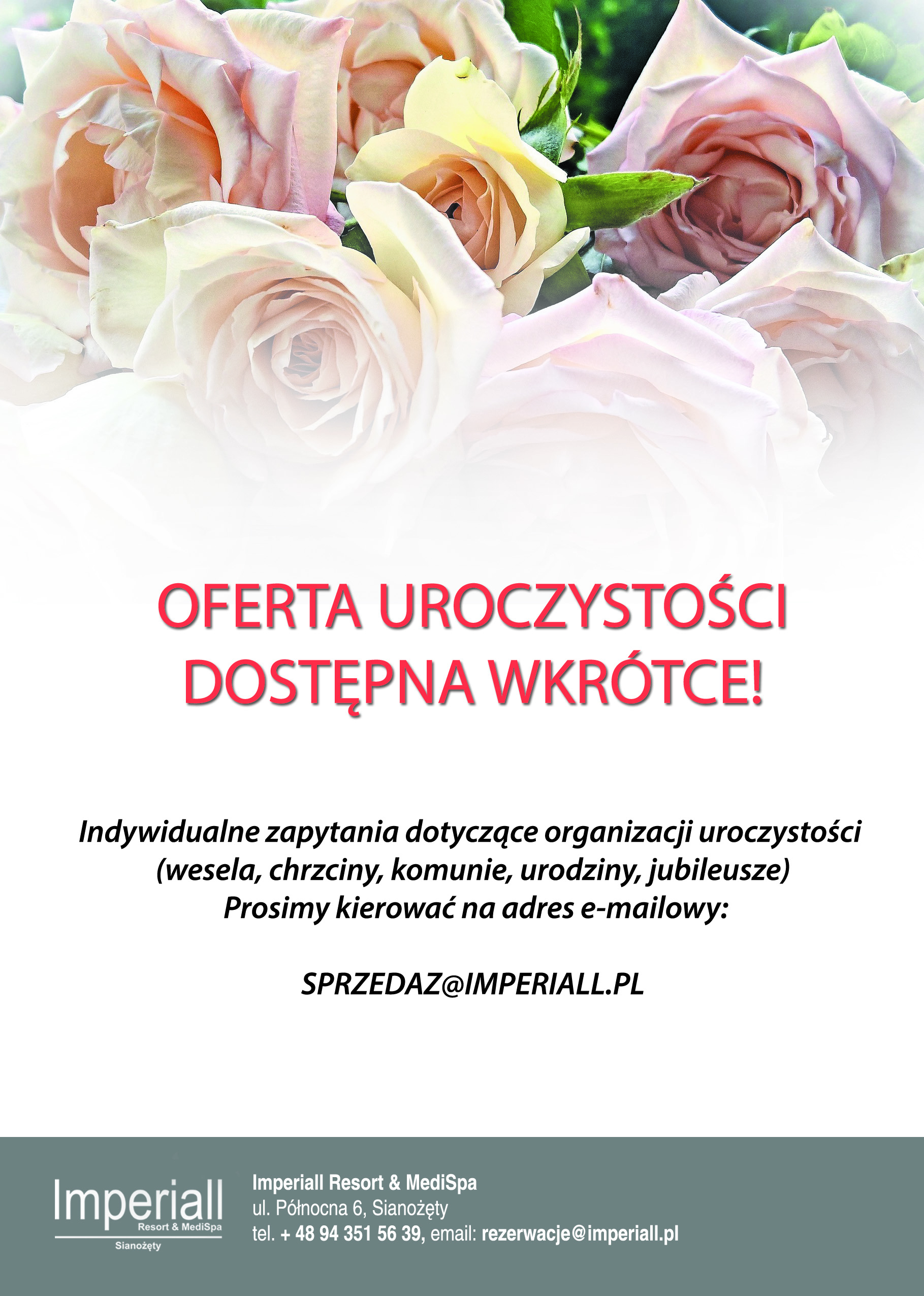 Imperiall Resort & MediSpa, to jedno z najbardziej niezwykłych miejsc przystosowane do organizacji imprez okolicznościowych. Posiadamy nowoczesne, przestronne, klimatyzowane sale w tym: sala Restauracyjna z zewnętrznym patio, Lounge Club oraz 3 Sale konferencyjne przystosowane na organizację przyjęć okolicznościowych.
